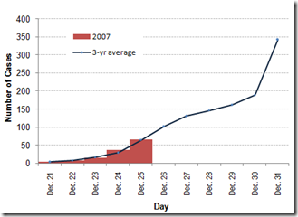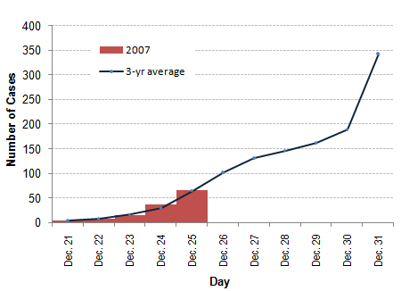 | Figure 1. Cumulative Cases by Day 3-Year Average (2004-2006) Vs. 2007* Fireworks Injury Surveillance |