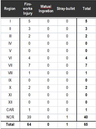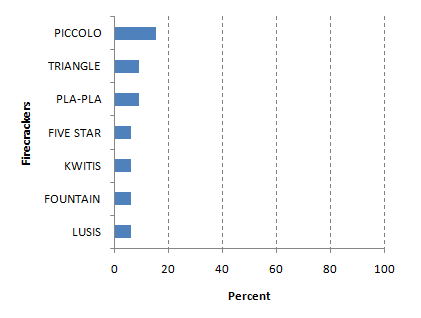 Majority, 58 (89%) were males, Ages ranged from 3 to 55 years (Median 15). Forty (62%) cases were from NCR (Table 1). Forty-one (64%) sustained blast/burn injury without amputation,16 (25%) with eye injury, 7(11%) with amputation and . Thirty-nine (60%) directly handled firecrackers, among which 9 (23%) were under the influence of alcohol. Piccolo, triangle, plapla were the most common type of firecracker used (Fig.2).