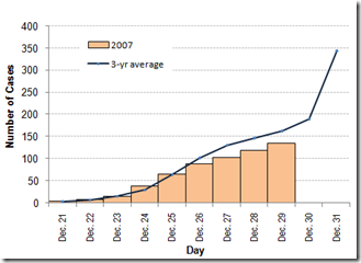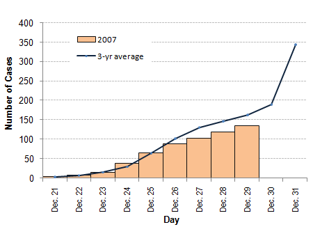 | Figure 1. Cumulative Cases by Day 3-Year Average (2004-2006) Vs. 2007* Fireworks Injury Surveillance | Official DOH Reports: | |