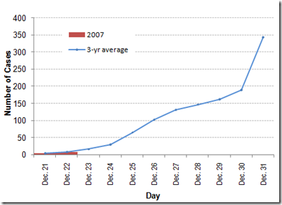 There are five new fireworks-related injuries reported today. The total number of cases since 21 December 2007 is eight, which is 14% higher compared to last three years average (Fig. 1). There are no cases of watusi ingestion and stray bullet injuries. No deaths reported.