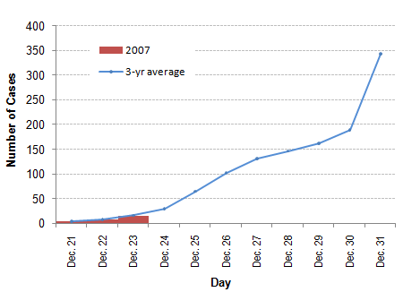 There were seven fireworks-related injuries reported today. There was no difference in the number of cases compared to the last 3 years average (Fig. 1). There were no cases of watusi ingestion and stray bullet injuries. No deaths reported.