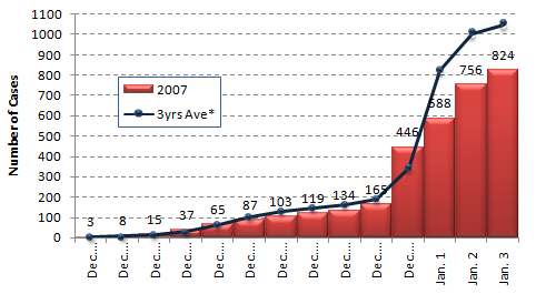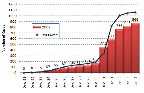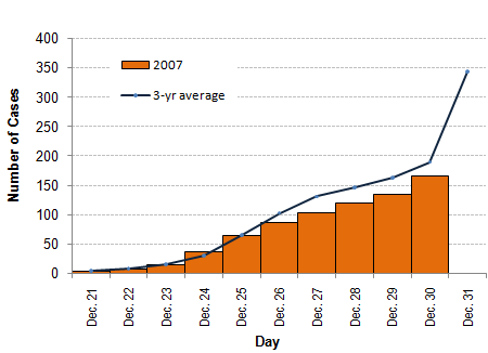 Figure 1. Cumulative Cases by Day 3-Year Average (2004-2006) Vs. 2007* Fireworks Injury Surveillance | | Official DOH Reports: Press Conference Presentation 123007 |