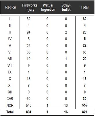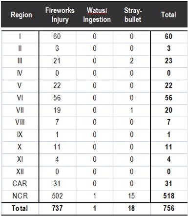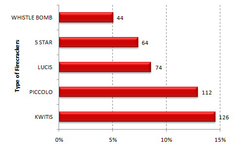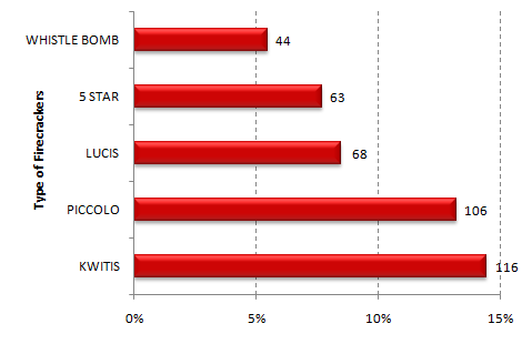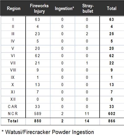 | Figure 1. | Cumulative Cases by Day 3-Yr Average (2004-2006) Vs. 2007 | | | | Figure 2. | Top-Five Firecrackers Used (N=850) Fireworks Injury Surveillance 2007 6:00 AM Dec. 21, 2007 - Jan. 5, 2008 | | | | | Cumulative Surveillance Findings | | A total of 850 fireworks related injuries, 14 stray bullet injuries, one watusi and one firecracker powder ingestion were reported from December 21, 2007– January 05, 2008 from 50 sentinel sites (Table 2). Forty-one ( 6% ) sustained injuries after January 1, 2008. There was one death (watusi ingestion) | | | | A. Fireworks-related Injuries | | Majority, 680 (80%) were males. Ages ranged from 4 months to 84 years (Median 15) : 302 (35%) cases were children 10 years and below. Five hundred eighty-nine (69%) cases were from NCR (Table 1). Six hundred thirty (74%) sustained blast/burn injury without amputation, 159 (19%) with eye injury, 61 (7%) with amputation. Four hundred thirty-six (51%) directly handled firecrackers, among which 71 (8%) were under the influence of alcohol. | | | | Table 1. | Number of Injuries by Region (N=866) Fireworks Injury Surveillance 2007 6:00 AM Dec. 21, 2007-Jan. 5, 2008 | ![clip_image002[4]](//lh6.google.com/esr.philippines/R387gKfqZDI/AAAAAAAAAYk/Ey2gGtEe6Dw/clip_image002%5B4%5D_thumb%5B1%5D) | | | | B. Watusi/Firecracker Powder Ingestion | | There was one reported case of watusi ingestion and one case of a 1-year old boy who ingested firecracker powder (Lucis) seen at Jose Reyes Memorial Medical Center. | | | | C. Stray Bullet Injuries | | There were fourteen stray bullet injuries. Upon verification another two earlier reported were due to deliberate shooting. | | | | Status of Reporting of Sentinel Hospitals | | Twenty-eight (56%) out of 50 hospitals submitted injury reports. | | | Subscribe to ESR Postings | | | | This is the last report for the Year. Thank you to the following: 50 Sentinel Hospitals, PNP, LGUs and Media Partners | | | | Official DOH Reports: | | | | | | To VOTE which amendments to RA 7183 you want to support, click on the poll question located on the upper-right corner of this webpage.