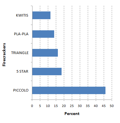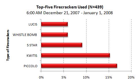 Figure 2. Top-Five Firecrackers Used (N=134) Fireworks Injury Surveillance 6:00 AM December 21-31, 2007 | | Piccolo is dangerous!!!  Piccolo is now banned! |