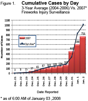 Figure 1. Cumulative Cases by Day 3-Year Average (2004-2006) Vs. 2007* Fireworks Injury Surveillance