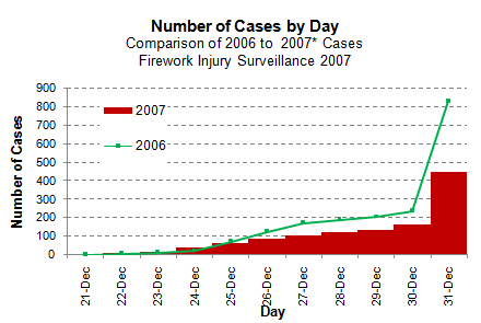 There are 31 new fireworks-related injuries reported today. The total number of cases as of 31 December 2007 is 165, which is 24 cases (13%) lower than previous 3-year average (Fig. 1) or 72 cases (30%) lower than the same period last year. There is no stray bullet and watusi ingestion incidence. No deaths reported.